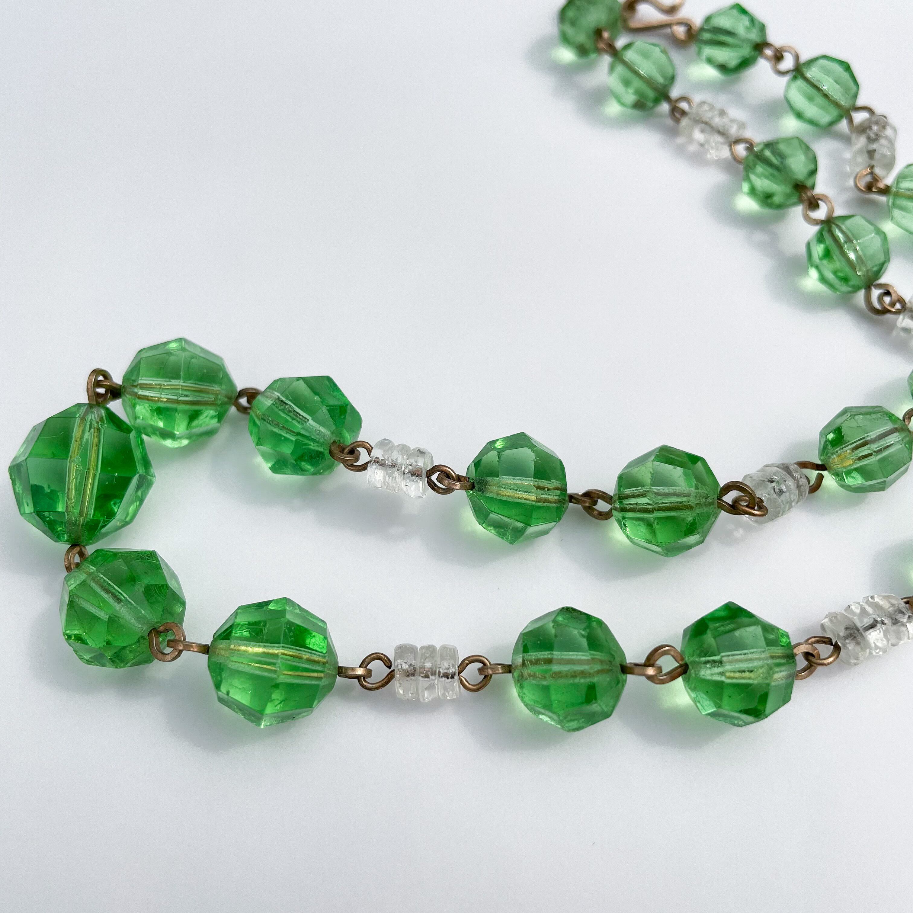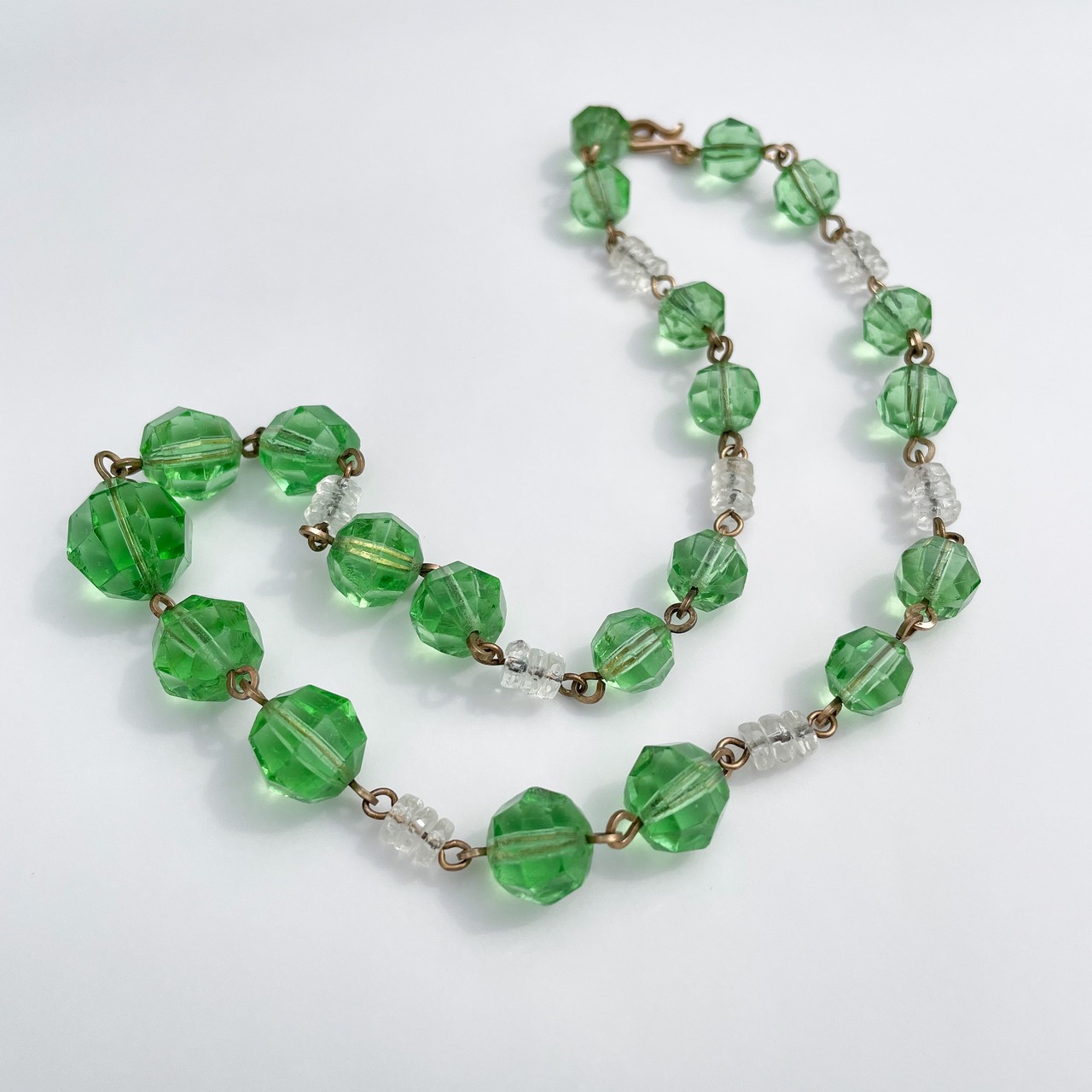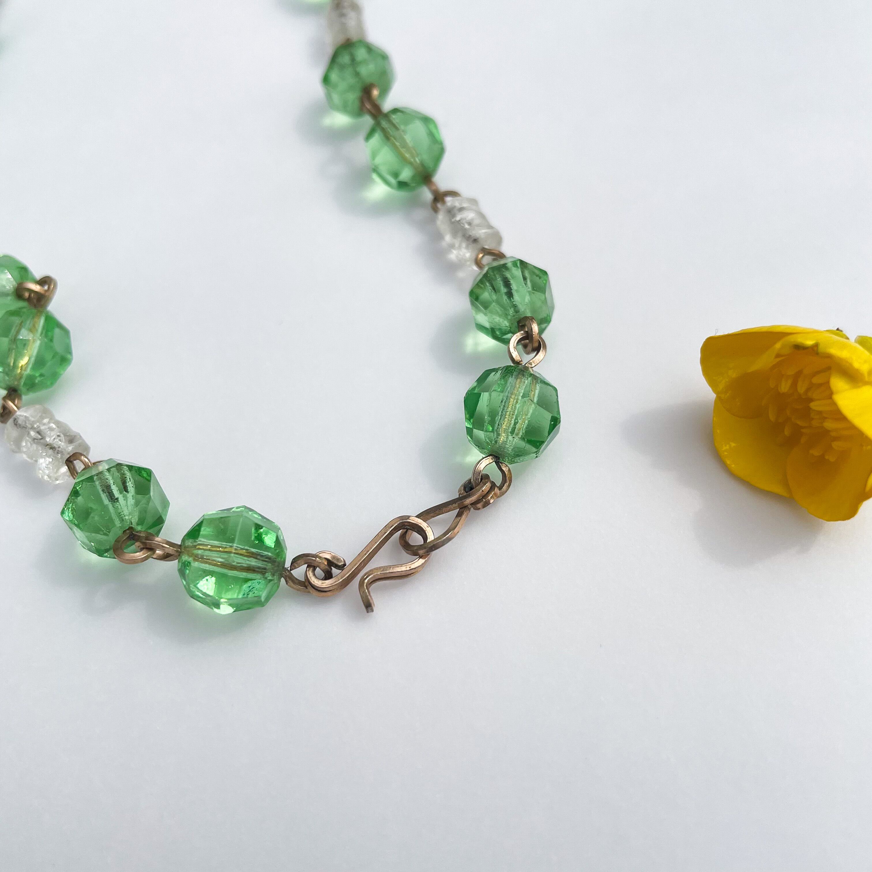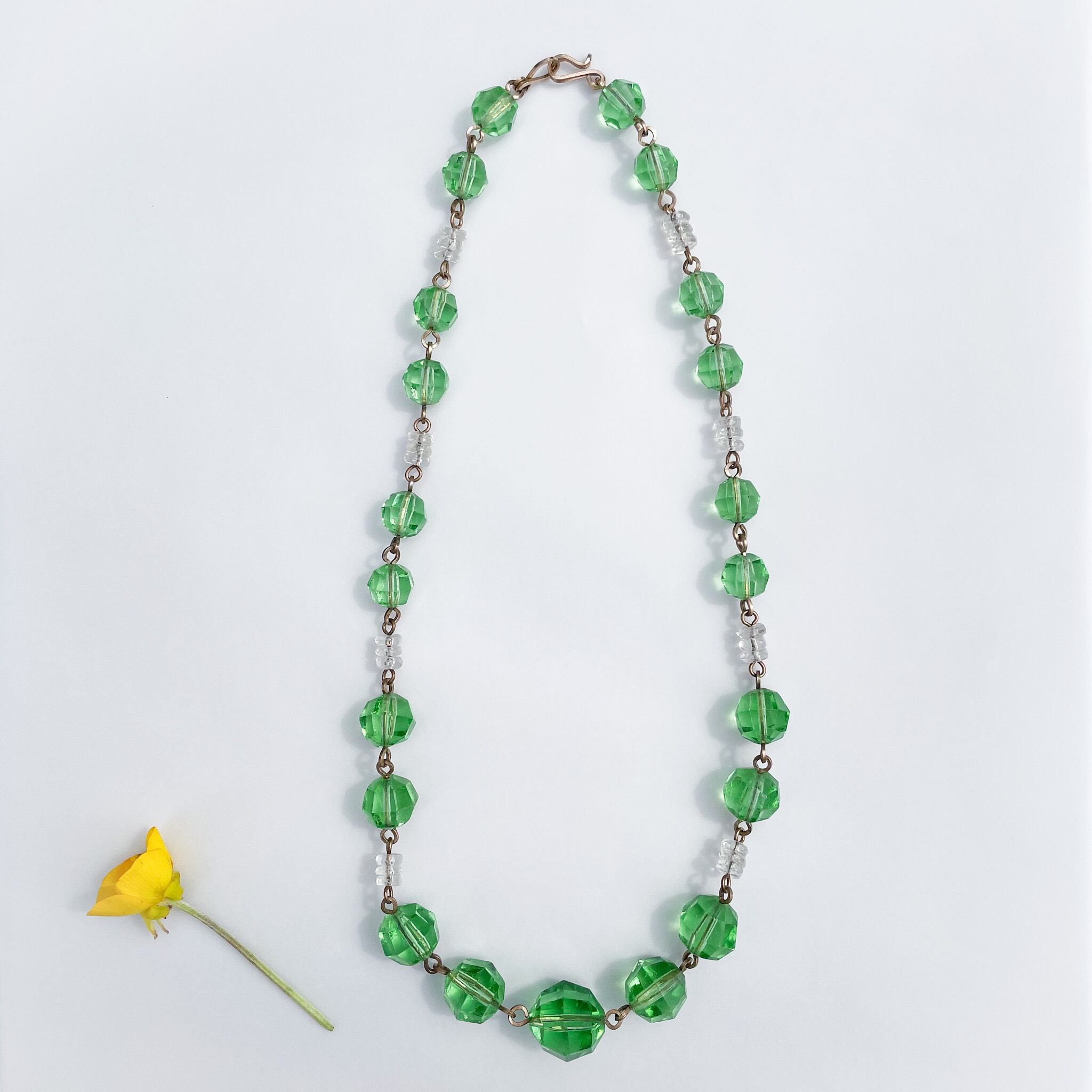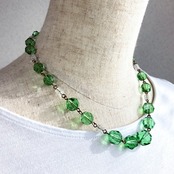 大粒でジューシーなグリーンと、ユニークな形をしたクリアガラスビーズのネックレス。