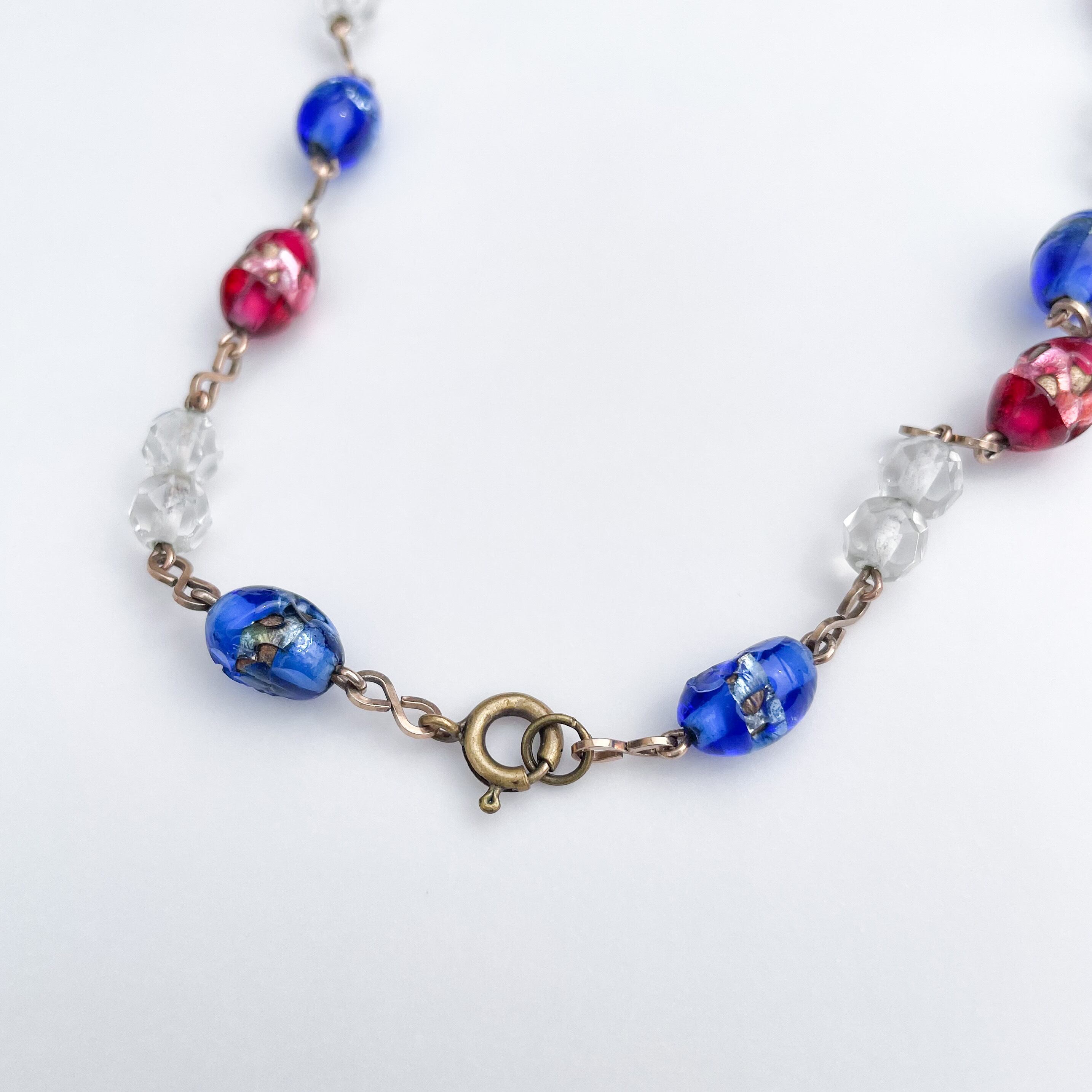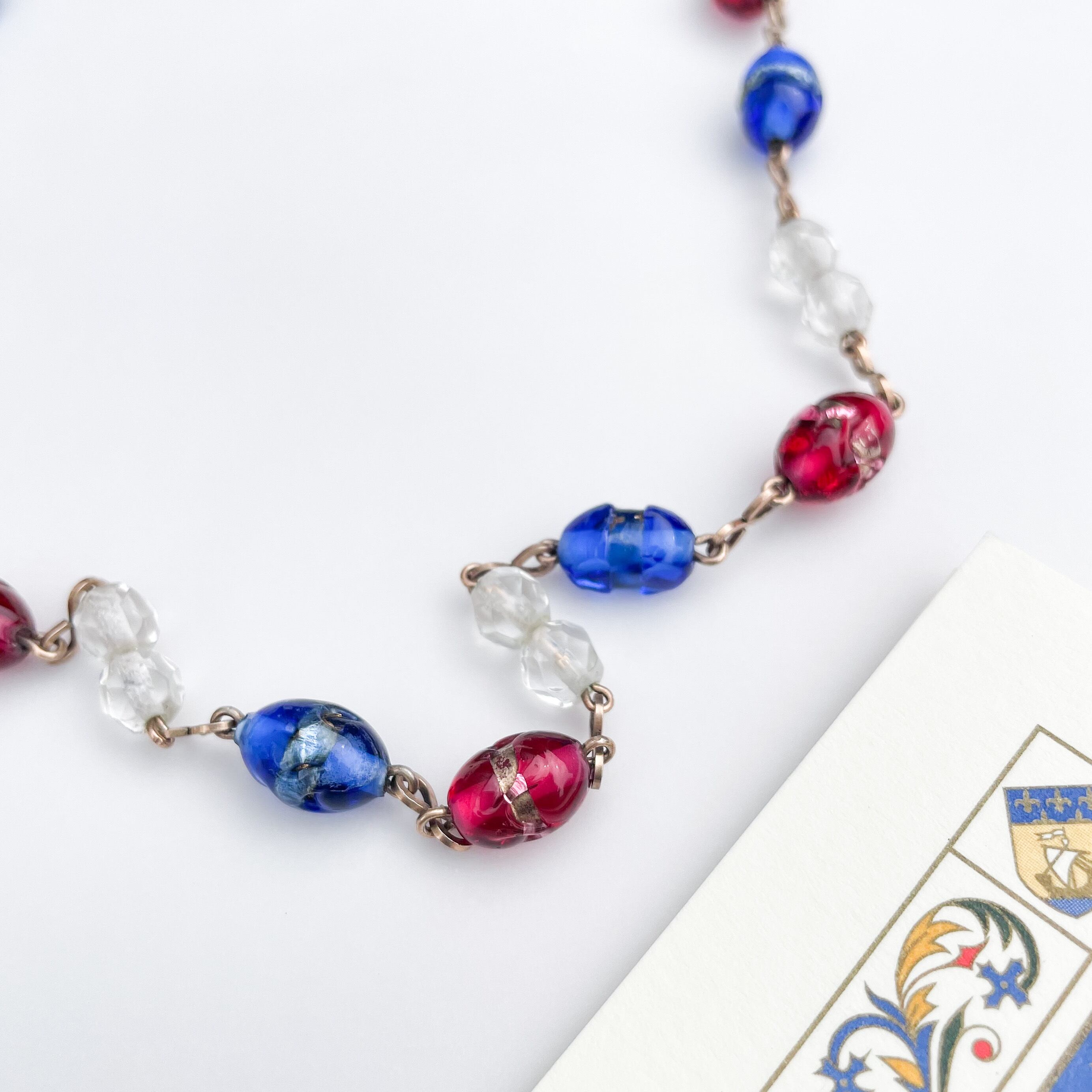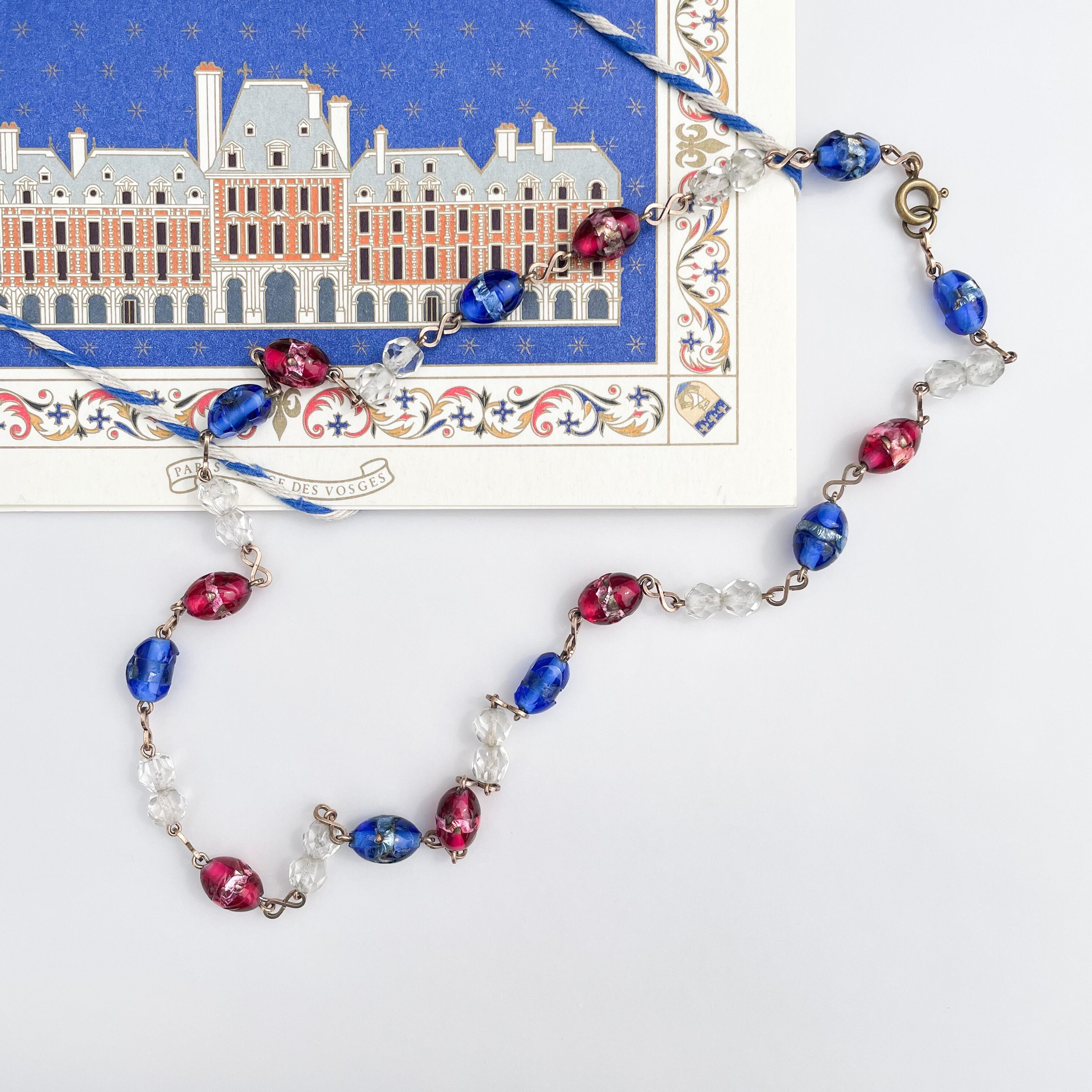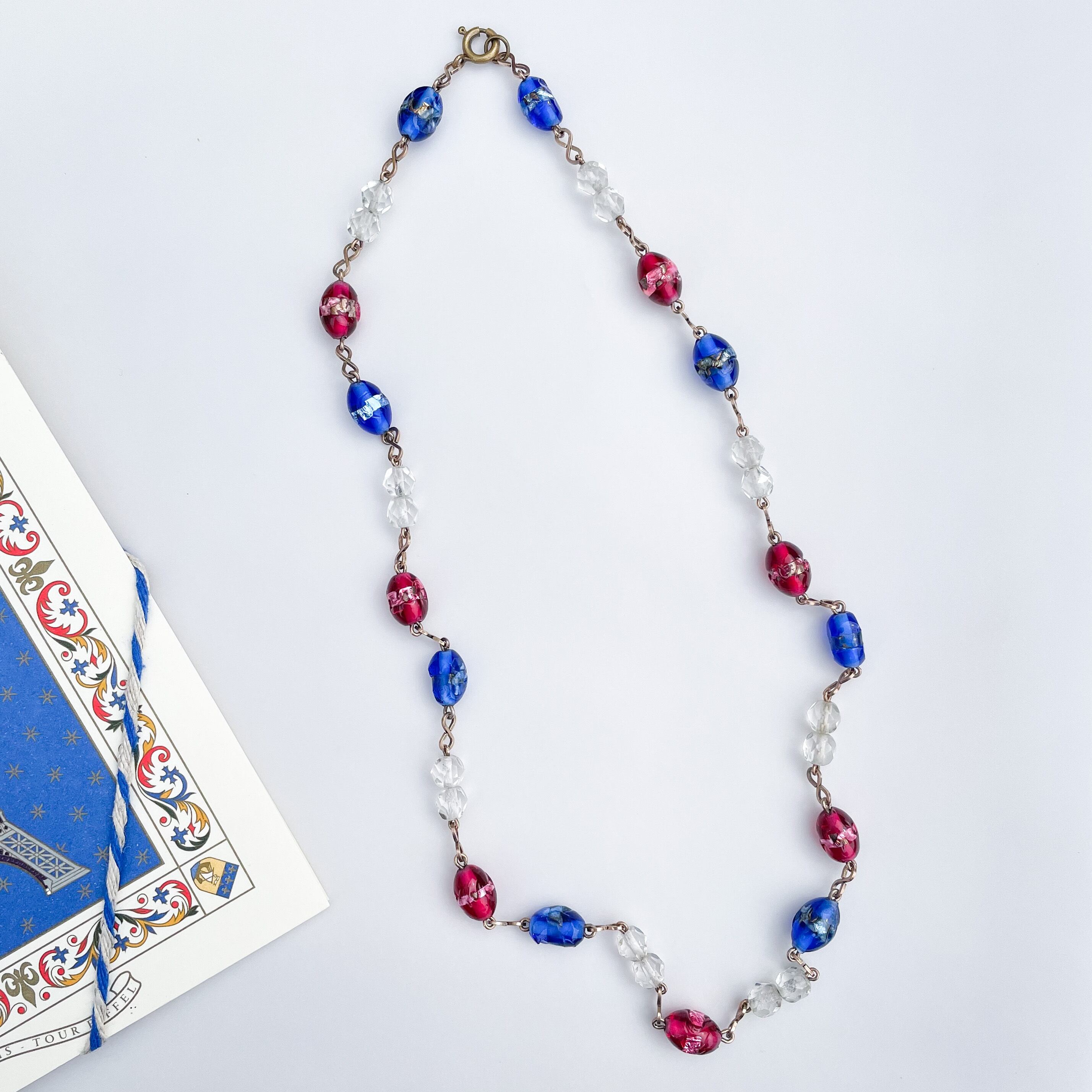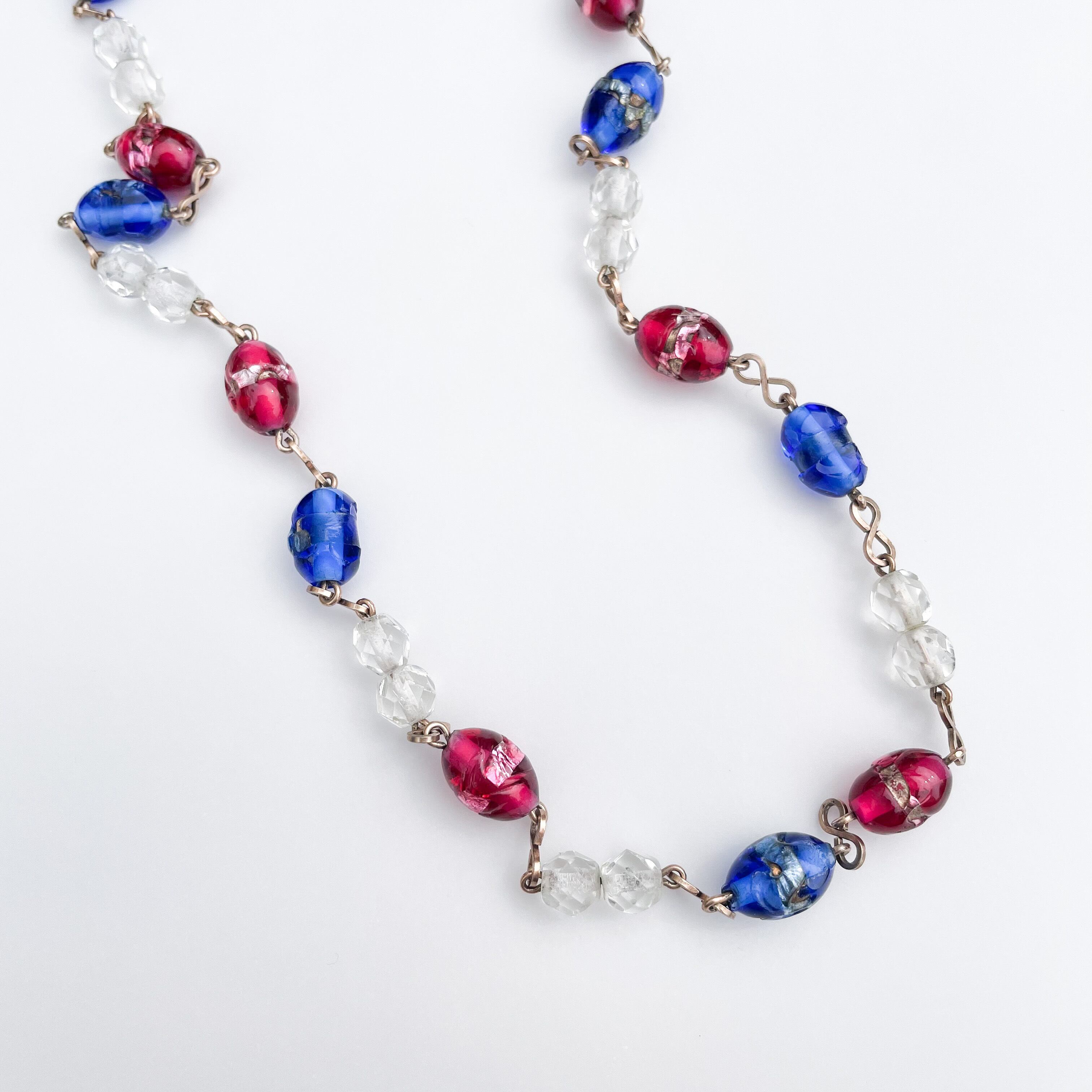 コバルトブルーとクランベリー、クリアの3色ガラスビーズで構成された、大人なトリコロールカラーのネックレスです。
