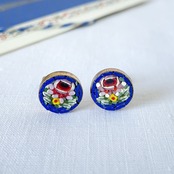 こちらのイヤリングは、大人な印象のコバルトブルーのタイルの中にやさしいピンクのバラと黄色の花が可愛らしく入っているデザインです。