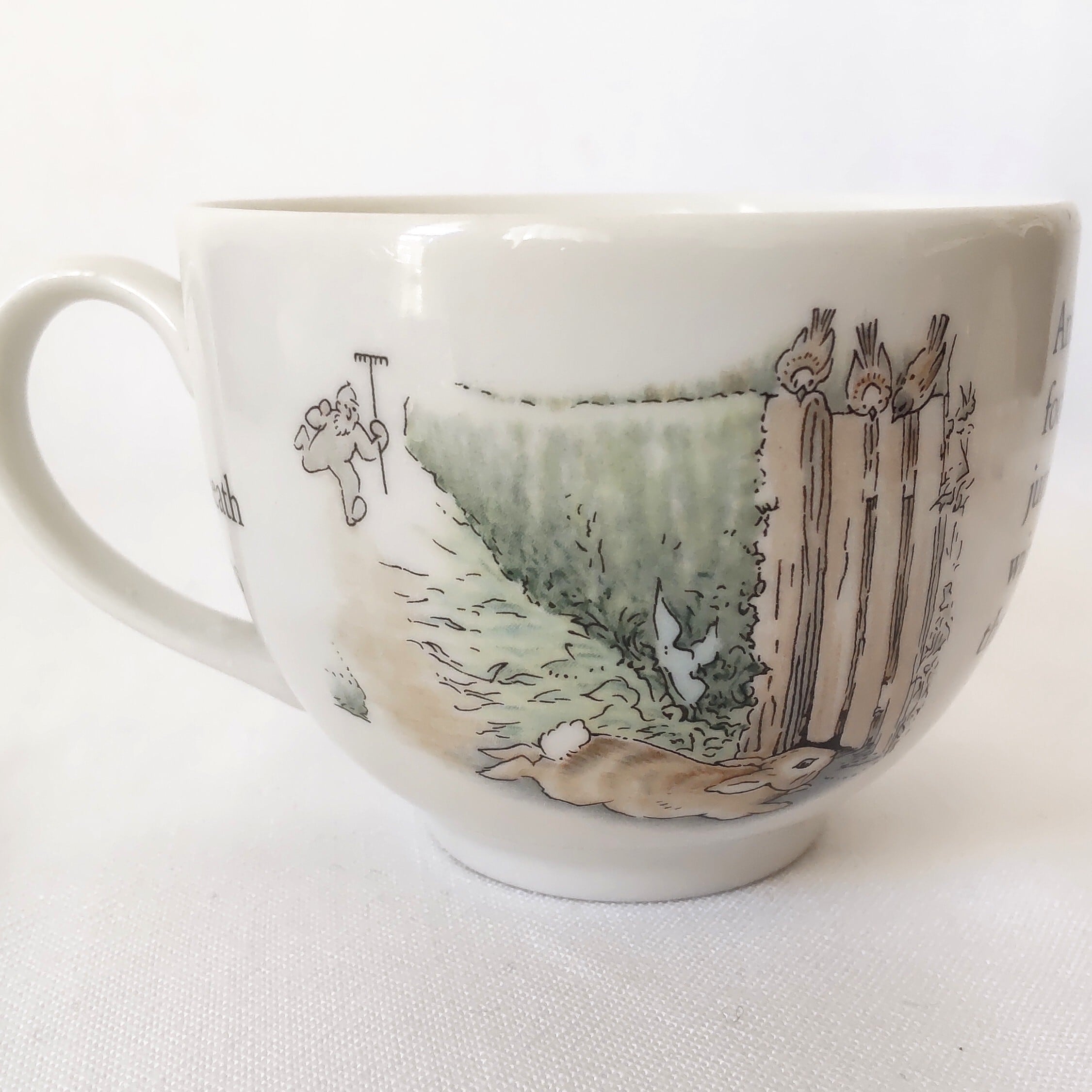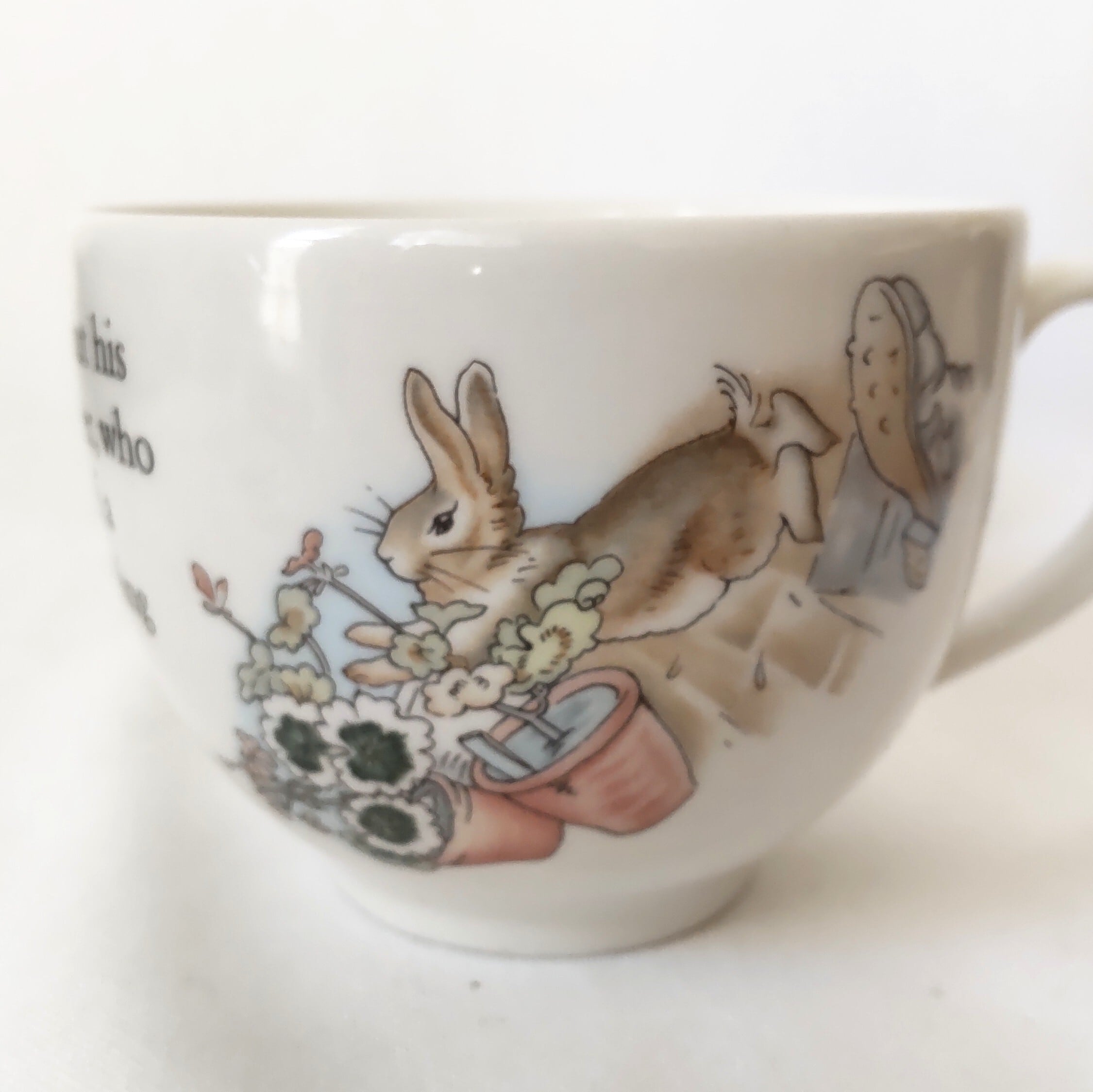 ピーターラビットシリーズは、1993年頃から絵柄が変更され、彩色もパステル系の薄め彩色となっており、カップ底の刻印も変更となっています。こちらのカップは旧刻印で、1993年以前のお品となります。こちらは彩色が濃いめで絵柄もはっきりとしており、艶もあります。