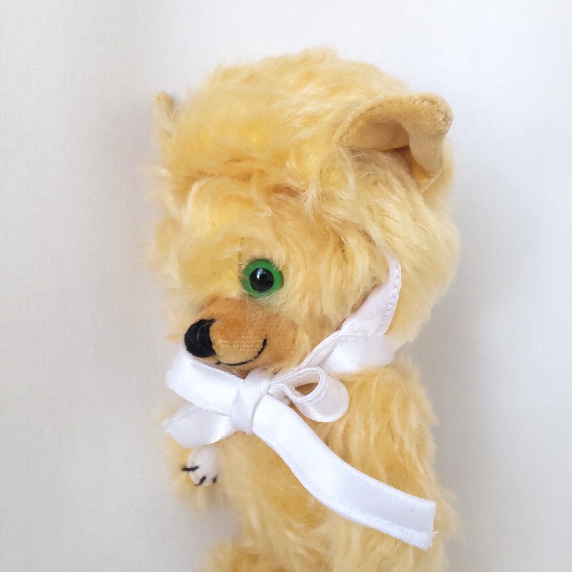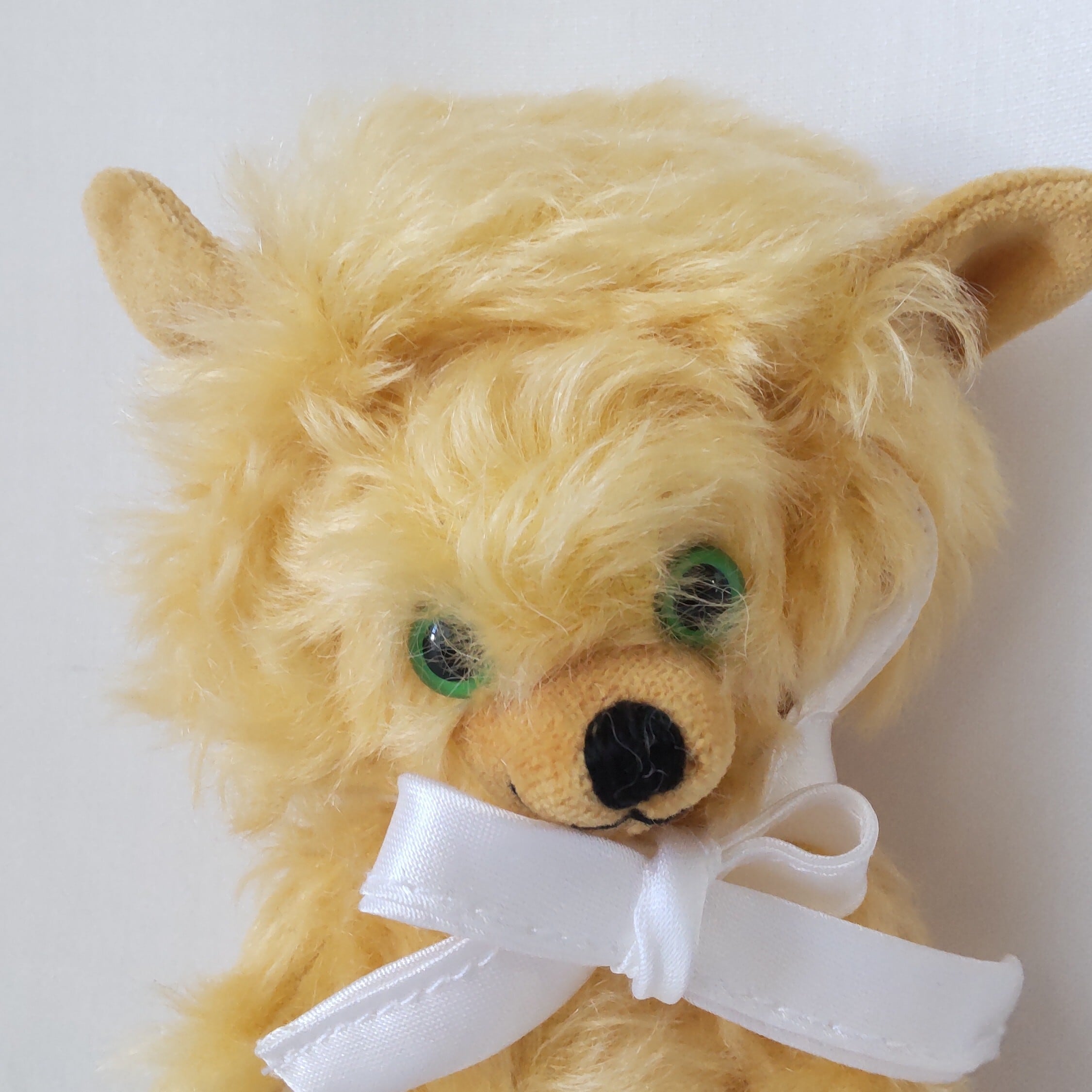 愛嬌のあるお顔で、目はきれいなグリーン色です。約14㎝と小さいながら5ジョイントで頭・手・足とも滑らかに可動します。